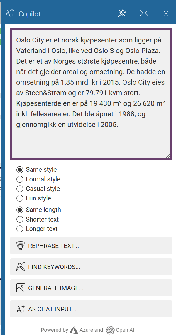 Systemet har innebygget "Copilot" som hjelper deg med å manipulere tekst. Den kan for eksempel sjekke formulering og endre stilen, eller gjøre teksten kortere eller lengere.